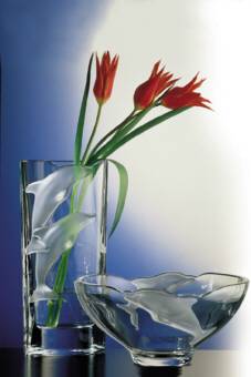 Glasklares Wasser, bewegte Wellen, springlebendige Delphine. Die Trinkgläser, Vasen, Schalen,